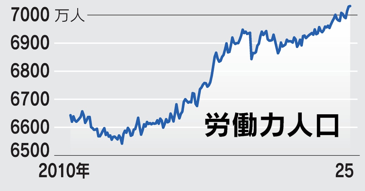 記事によると、「総務省の労働力調査によると、すでに働いている就業者の数と失業者数を合わせた労働力人口(原数値)は11月に7033万人だった。7カ月連続で7000万人を超えた。1〜11月までの平均は7004万人だ。1年前の1〜11月平均に比べ40万人超増加した。」そうです。少子高齢化で、日本の人口は減少傾向にありますが、働く人は、女性と老人、そして外国人を中心に増えているようです。働く人は増えていますが、働く時間は減少しているとも書かれていて、自分たちの生活に合わせて柔軟に仕事を探していると思われます。